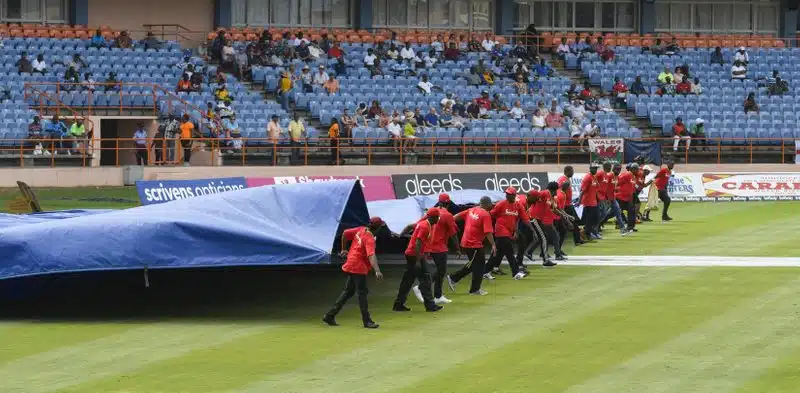 England captain Eoin Morgan put the West Indies to bat but the showers which delayed the toss returned before the players could get on the field at the National Stadium.