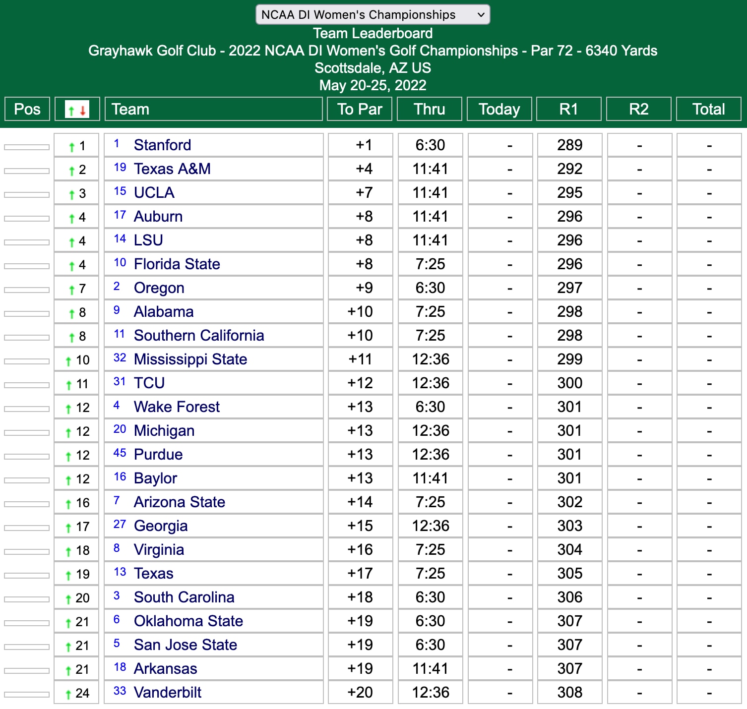 The first groups teed off at 9:30 a.m. ET/6:30 a.m. PT at the 2022 NCAA DI Women's Golf Championships at Grayhawk Golf Club in Scottsdale, Ariz., to start the second round on Saturday morning. Stanford (+1) took a three-stroke lead over Texas A&M (+4) into the second round after shooting an opening-round 289.