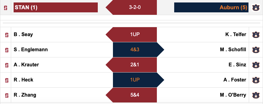 Auburn didn't make it easy for the Cardinal. Two of the three matches Stanford won went down to the final two holes. Brooke Seay ultimately won the match for Stanford with a birdie on 18. Along with Seay, Aline Krauter won 2&1, while Rose Zhang was able to close out early with a 5&4 win.