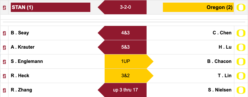 At the end of Saturday, it seemed like Oregon had a chance to make the hunt for the top spot going into match play closer than most expected. The Cardinal widened that gap over the Ducks in round three shooting 5-under as a team to take a nine-stroke lead into Monday as of now.