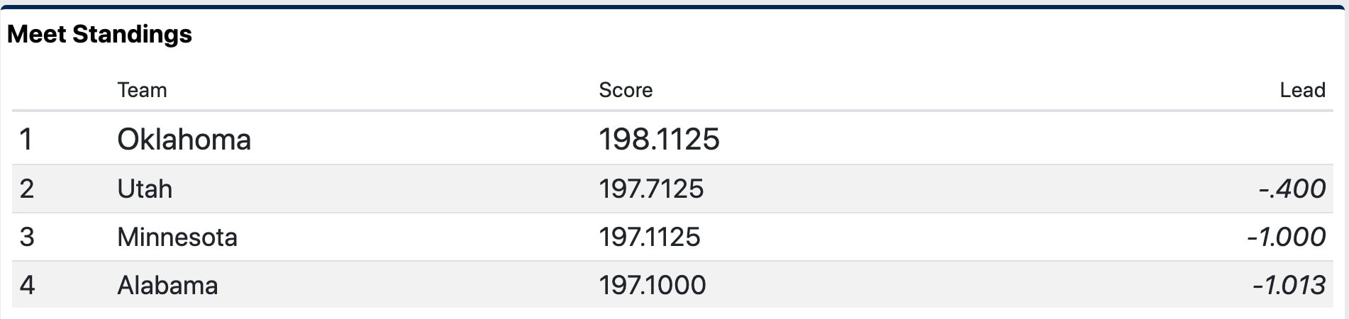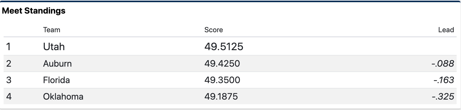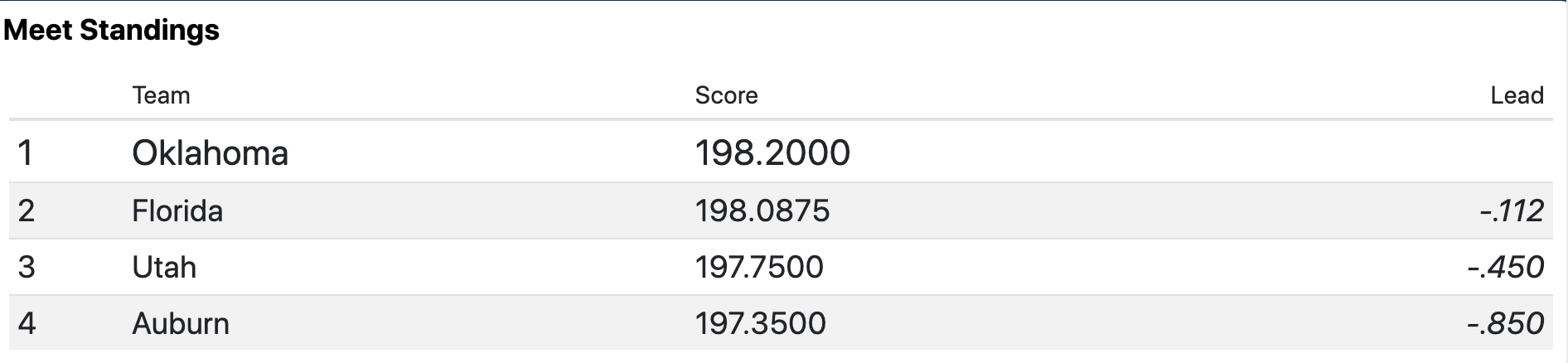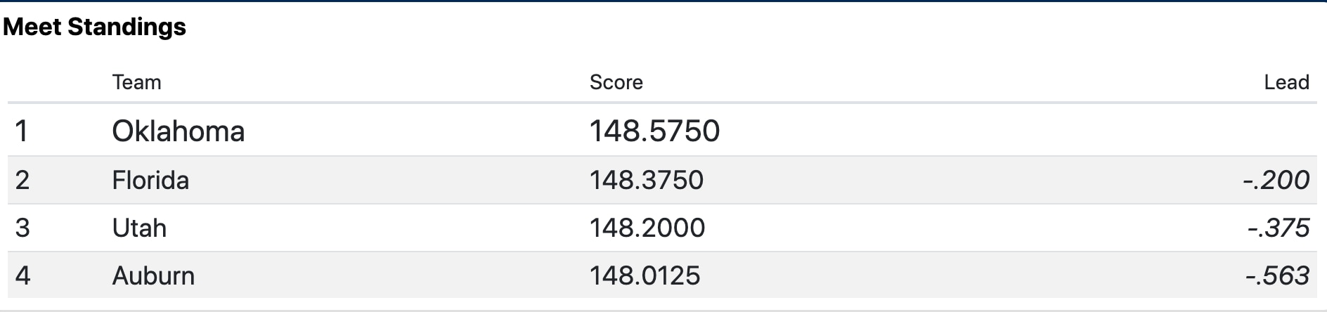 Oklahoma takes the lead followed by Florida after the third rotation