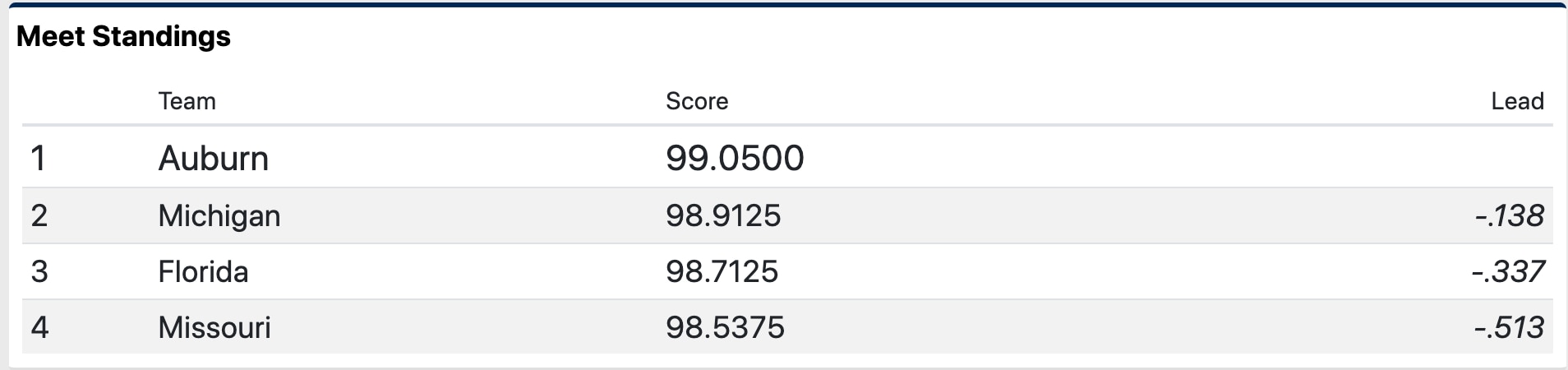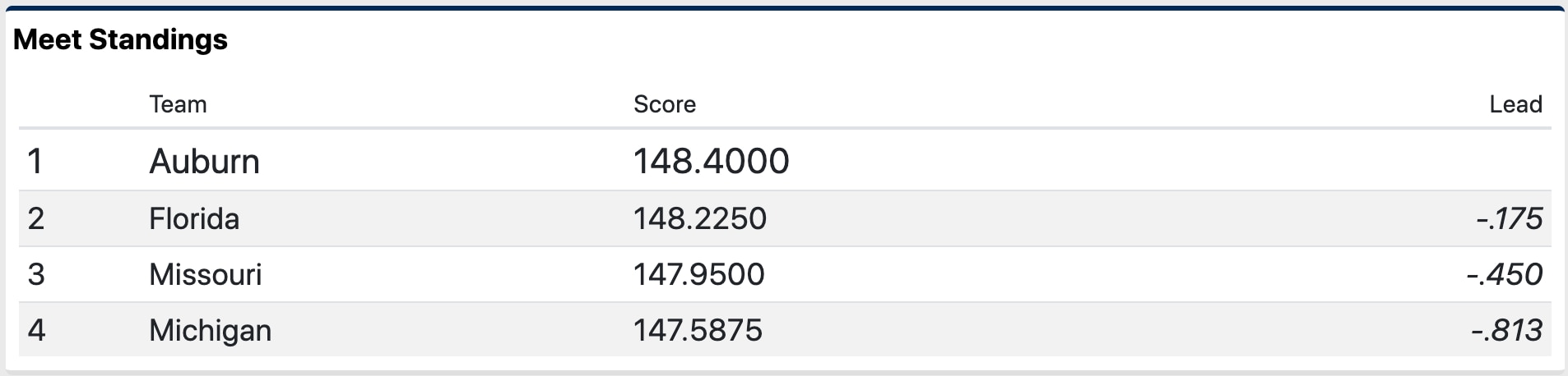 Auburn fell to fourth place after the second rotation and will need a solid third rotation on floor. Here is the score breakdown after two rotations: