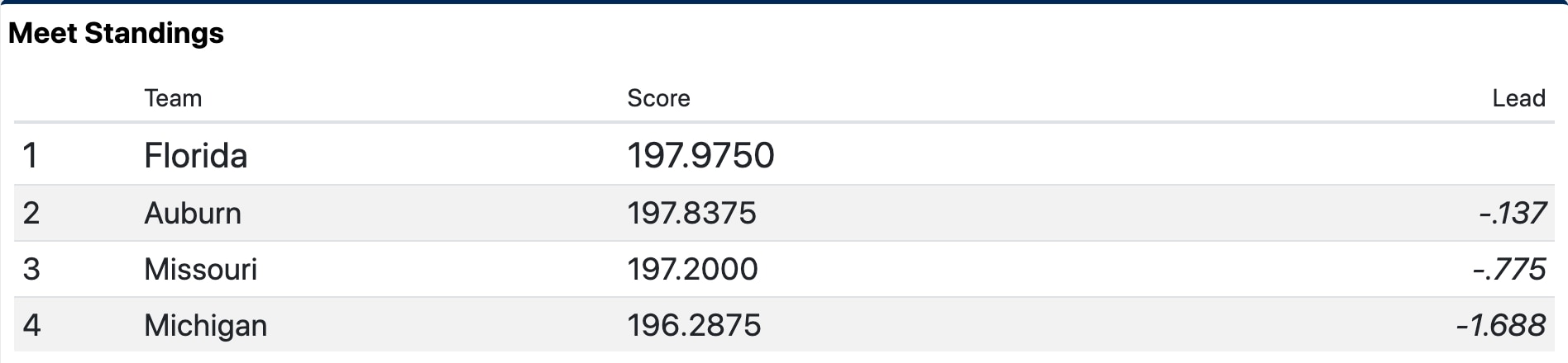 Florida is a heavy favorite heading into today's competition after putting up the third highest all-time score of 198.775 in the regionals.