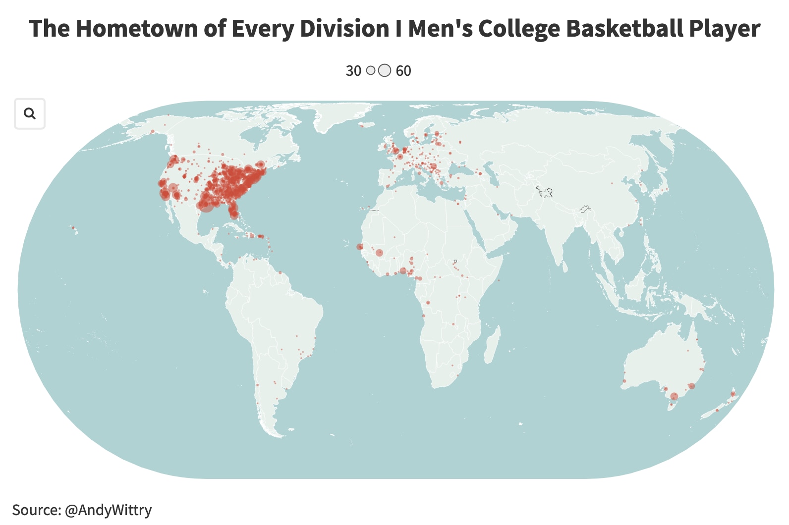 Below is a world map with the hometown of every current DI men's basketball player. .