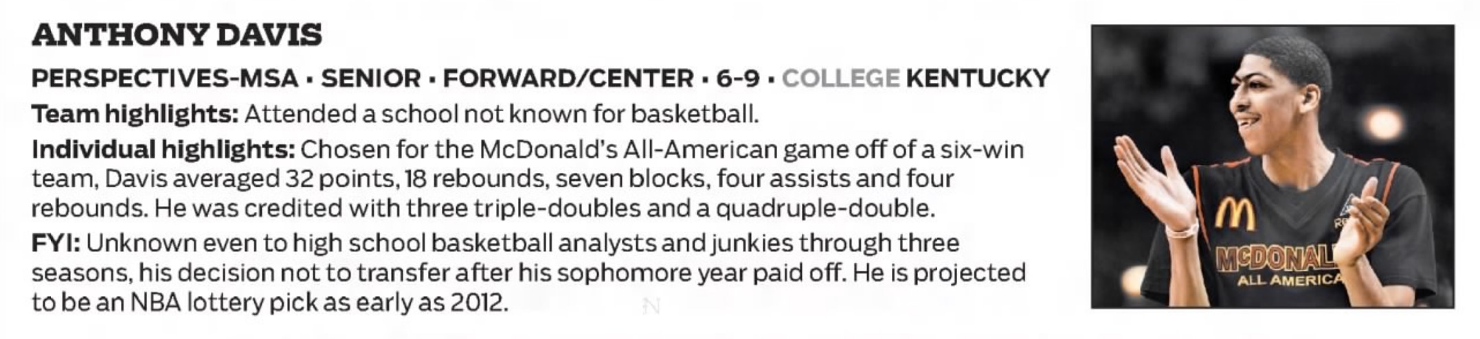 High school opponent Sam Thompson of Whitney Young High School in December 2010: "I've known him for a long time. He's a good guy. I was surprised by the way he blew up this summer. The Anthony Davis I knew was 6-3 and wore goggles."