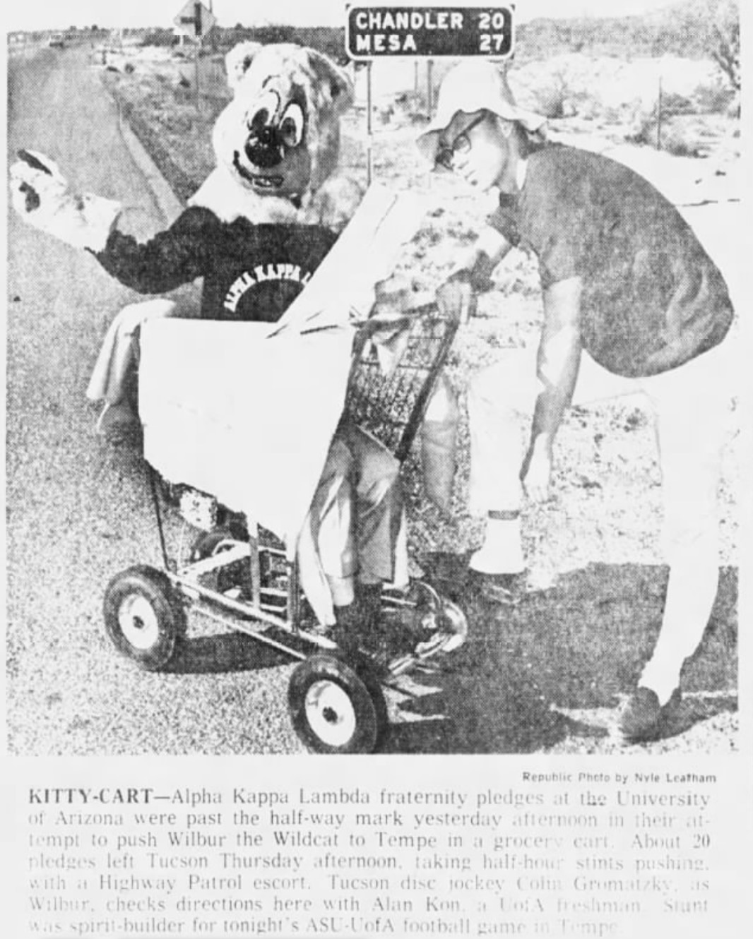 Over the years, Wilbur the Wildcat has been involved in numerous marketing and publicity campaigns. The Arizona Republic reported in November 1965 about how fraternity pledges at Alpha Kappa Lambda attempted to push Wilbur the Wildcat from Tucson to Tempe, taking half-hour shifts, with a patrol escort prior to an Arizona-Arizona State football game.