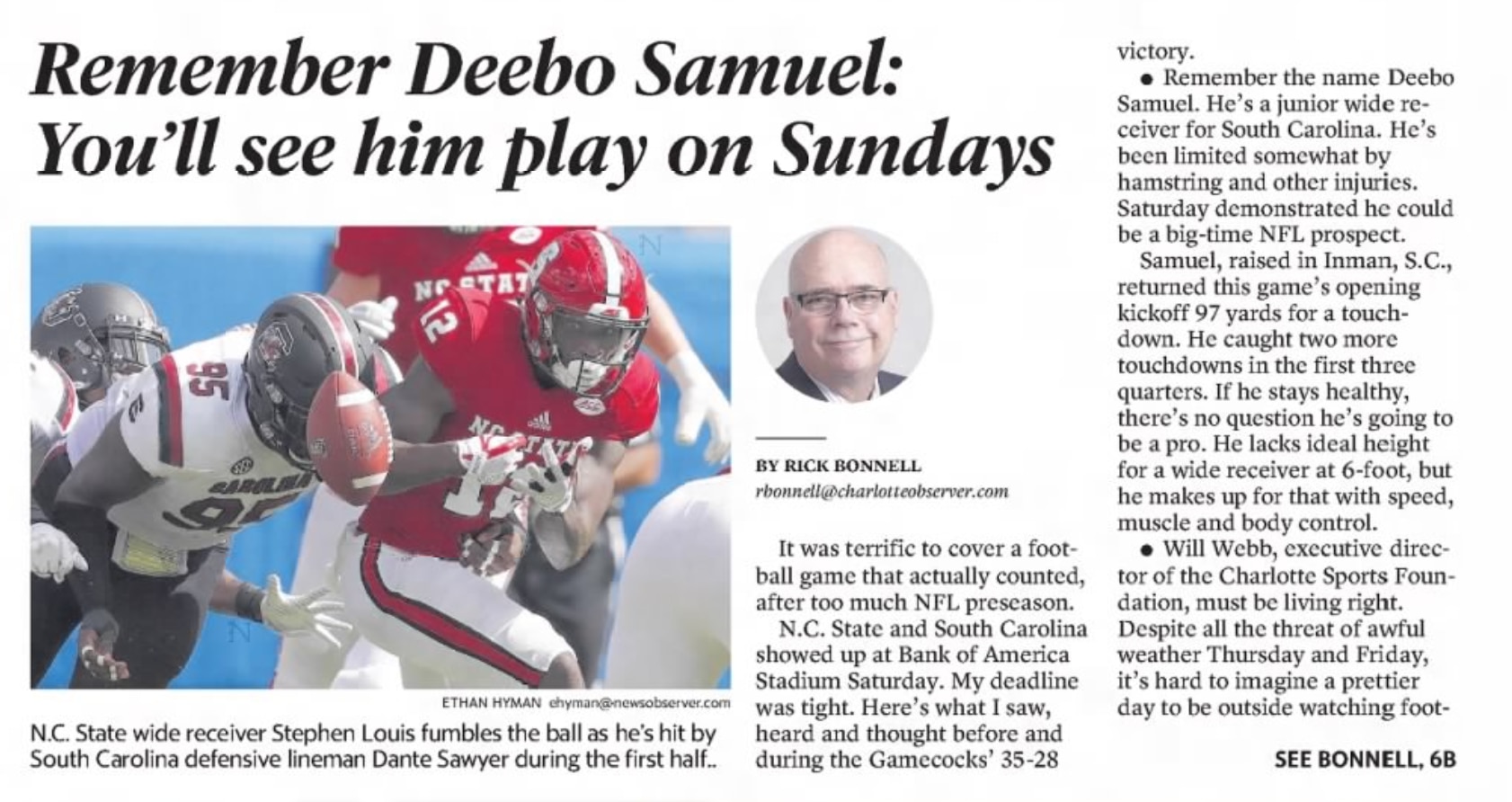 The Charlotte Observer's Rick Bonnell, after Samuel scored three touchdowns against NC State: "Remember the name Deebo Samuel. He's a junior wide receiver for South Carolina. He's been limited somewhat by hamstring and other injuries. Saturday demonstrated he could be a big-time NFL prospect. Samuel, raised in Inman, S.C., returned the game's opening kickoff 97 yards for a touchdown. He caught two more touchdowns in the first three quarters. If he stays healthy, there's no question he's going to be a pro. He lacks ideal height for a wide receiver at 6-foot, but he makes up for that with speed, muscle and body control."