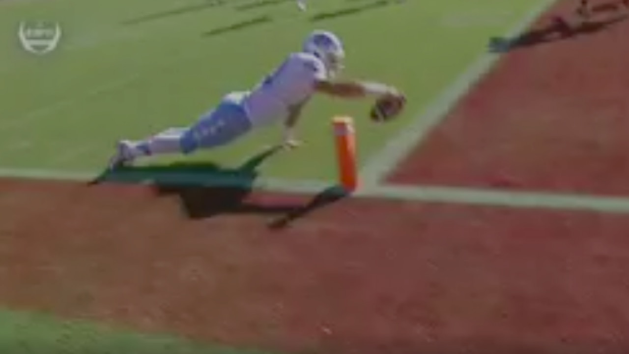 The topper here is Trubisky's presence of mind after he takes off on the run. As he dives for the goal line, the junior quarterback still has the presence of mind to use his off hand to keep from making contact with the ground before breaking the plane of the endzone with the football.