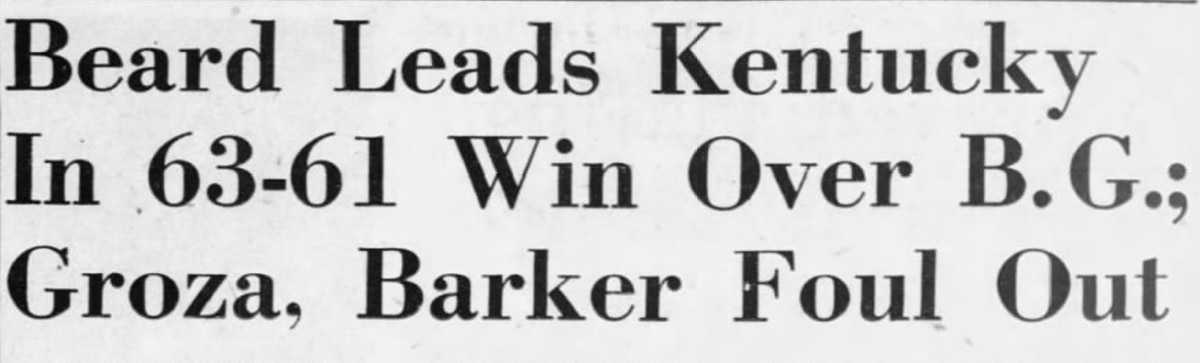 "Ohio U. paced by Dick Shrider's 24-point shooting, led twice in the first half, and the score was tied four other times, but the once-beaten Cats were ahead, 35-25, at halftime," reported the AP. "After the Ohioans pulled within six points, Al Groza and Jim Line sparked a Kentucky rally which put the Wildcats in front, 54-34, with seven minutes of final half played."