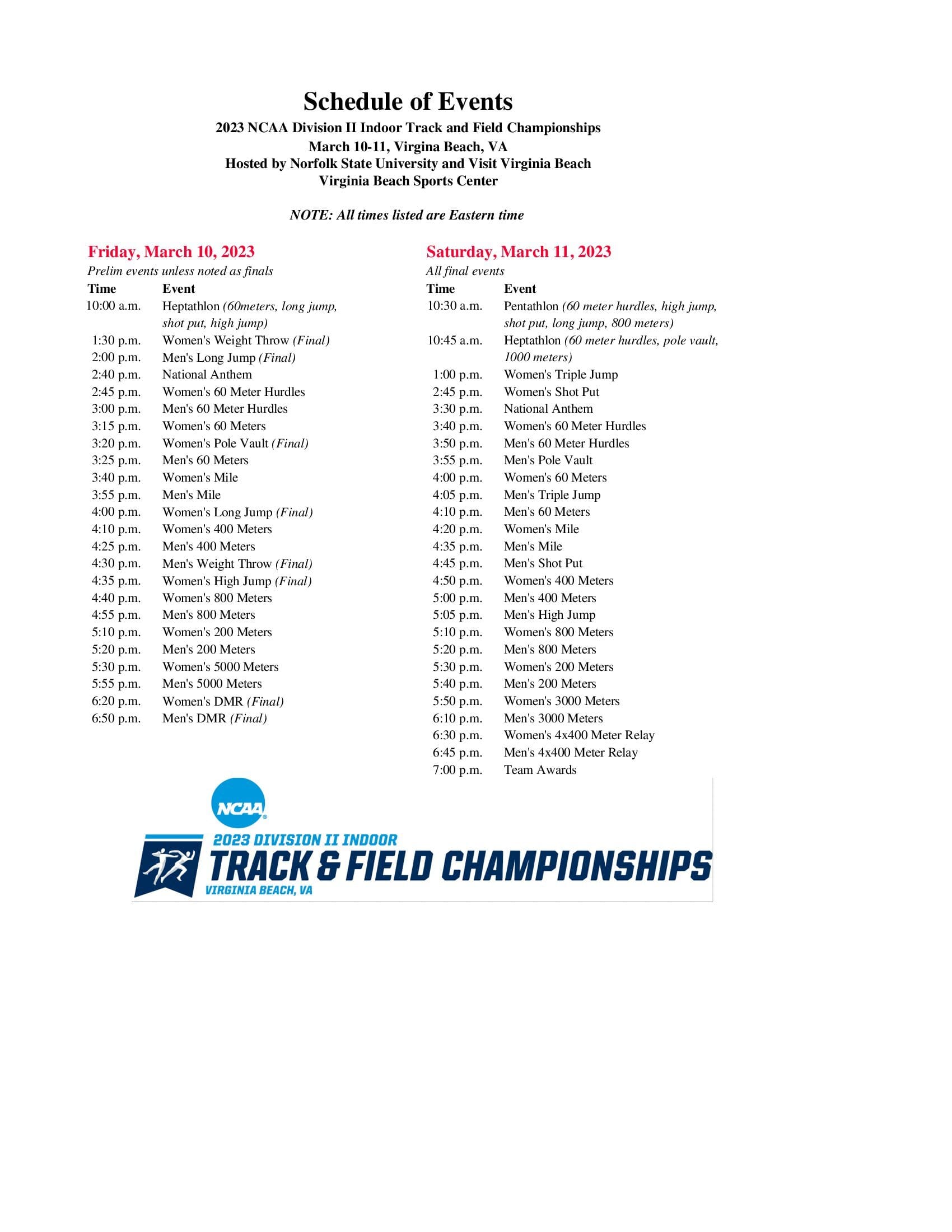 The 2023 championships will take place on Friday, March 10 and Saturday, March 11 at the Virginia Beach Sports Center in Virginia Beach, Virginia.