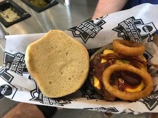 Review: No. 3 hitter. The Home Run Burger is a great way to fill an empty stomach and you might have enough room for a side of fries. The onion rings add a nice crunch, while the hot and spicy pickles bring some kick.