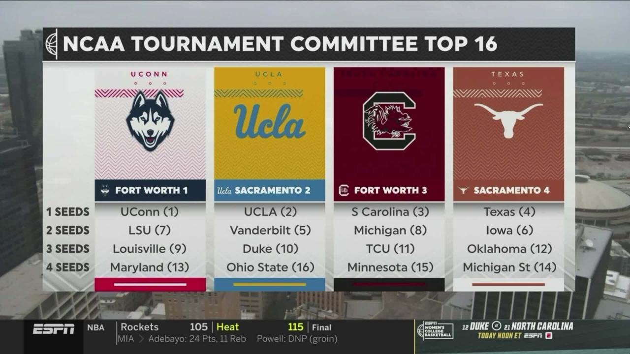 The committee also provided regional assignments for all 16 seeds. Fort Worth 1 consists of UConn, LSU, Louisville and Maryland. UCLA, Vanderbilt, Duke and Ohio State were placed in Sacramento 2, while Fort Worth 3 features South Carolina, Michigan, TCU and Minnesota. Texas, Iowa, Oklahoma, and Michigan State were assigned to Sacramento 4. The number listed next to the regional site location (e.g. Fort Worth 1) reflects the true seed number of the number one seed within that respective regional pod.
