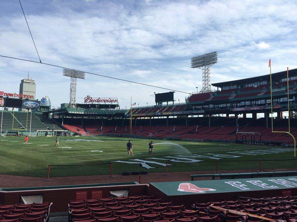 America's oldest Major League ballpark has a new look to it. Inside the Pesky and Fisk foul poles with the Green Monster as a backdrop, hash marks and a pair of field goal posts now stand in place where the Boston Red Sox have called home since 1912.