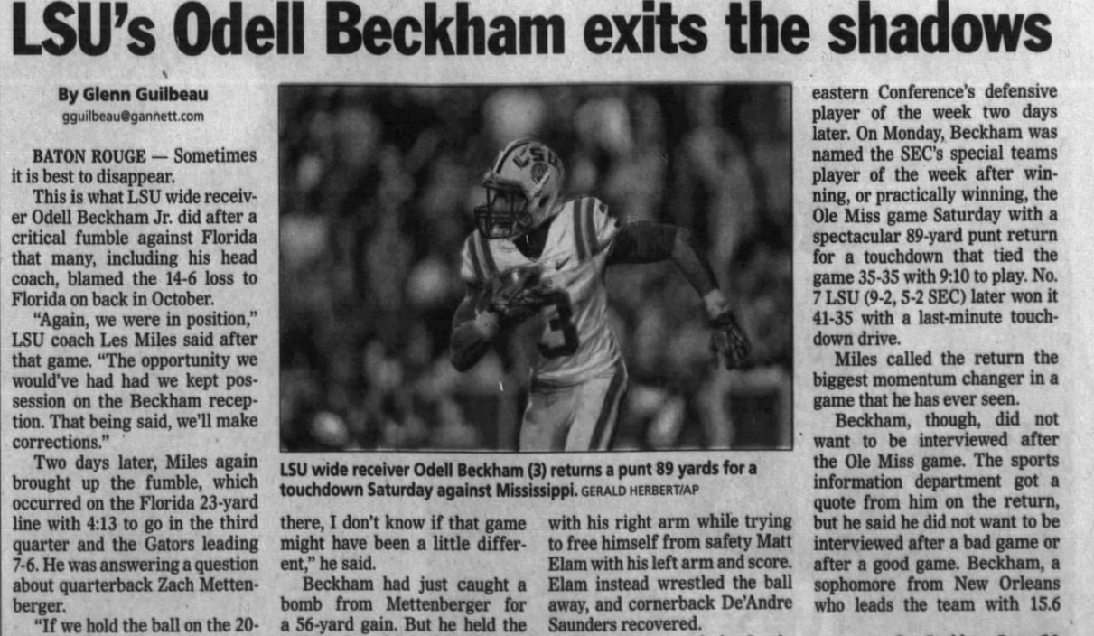 Louisiana Gannett News' Glenn Guilbeau, on Beckham's 89-yard punt return touchdown against Ole Miss in 2012: "On Monday, Beckham was named the SEC's special team player of the week after winning, or practically winning, the Ole Miss game Saturday with a spectacular 89-yard punt return for a touchdown that tied the game 35-35 with 9:10 to play. No. 7 LSU (9-2, 5-2 SEC) later won it 41-35 with a last-minute touchdown drive. (Les) Miles called the return the biggest momentum changer in a game that he has ever seen. Beckham, though, did not want to be interviewed after the Ole Miss game. The sport information department got a quote from him on the return, but he said he did not want to be interviewed after a bad game or after a good game."